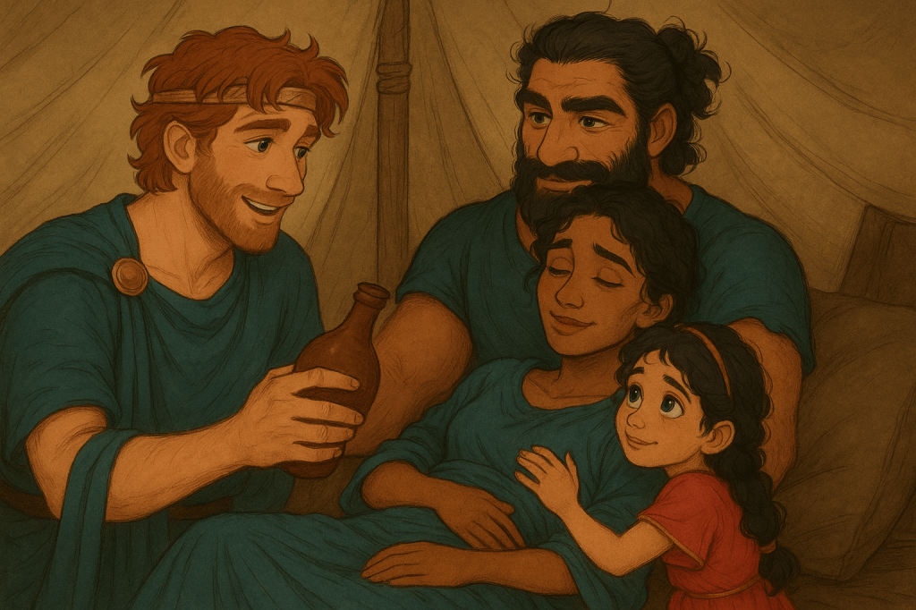 Dionys didn’t leave her side—not even when the fever worsened, when her skin grew flushed and slick with sweat, when her delirious cries fractured the quiet of the tent. He propped her up carefully, her back against his chest, holding the cup of willow tea to her lips.