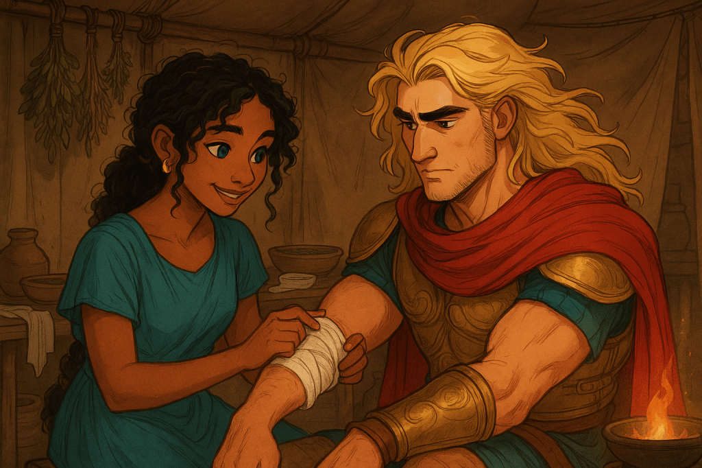 She took the bandages without complaint—mostly because she knew patching him up would take less time than arguing—and gestured for him to sit.