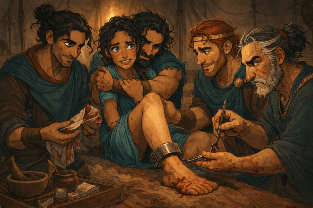 The physician was already there, pressing clean linen to the wound, binding it tight with quick, sure hands. The pain must have been unbearable, but Alessia didn’t scream. She didn’t thrash. She just breathed, shuddering through it as Patrian murmured something low and soothing to the newly exposed skin.